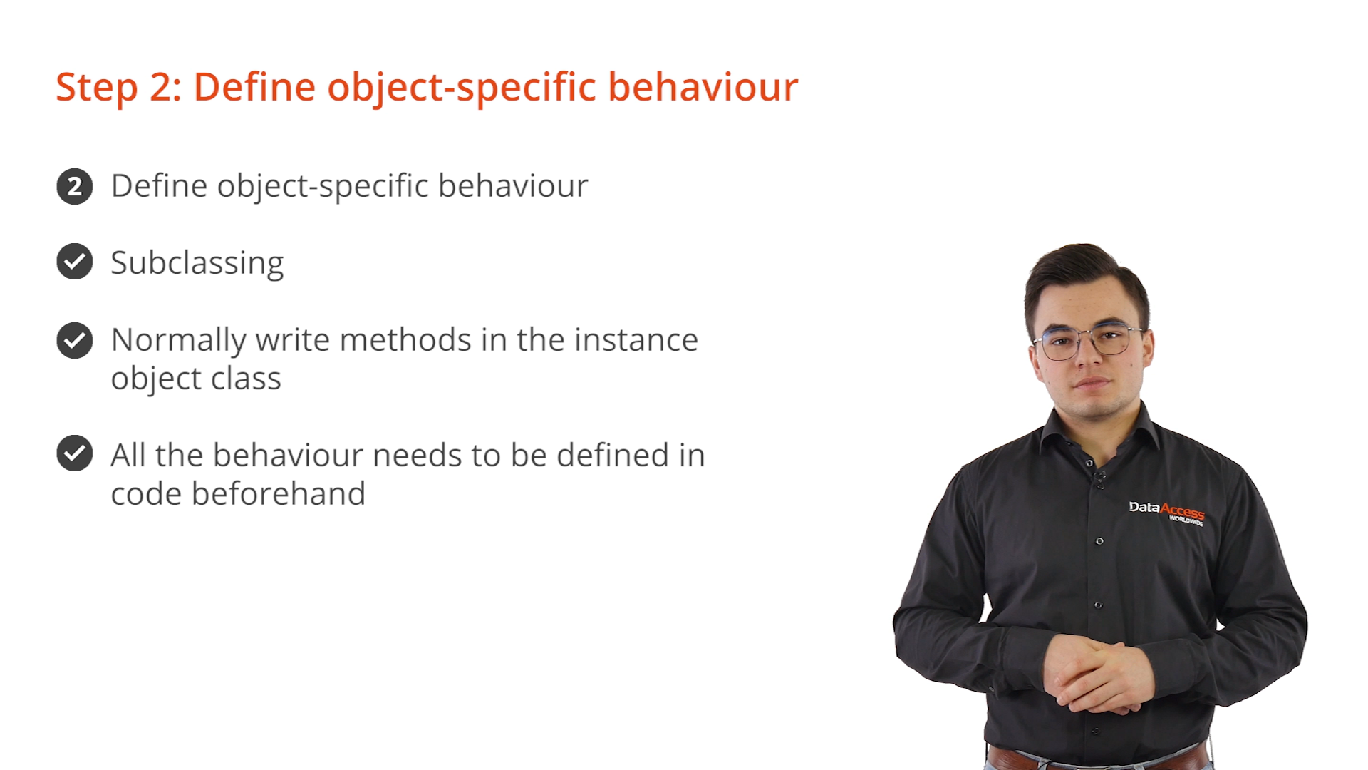 The second step of the workflow is defining object-specific behavior. Examples of behaviors are methods, procedures and event handling. The dynamic objects framework uses subclassing to define behaviors. Note that methods are normally written in the instance object of a class. This is not possible with dynamic objects, because it requires inserting new source code at runtime. Therefore, all the behaviors need to be defined in code beforehand. This imposes a restriction on the framework, so please be aware of it.