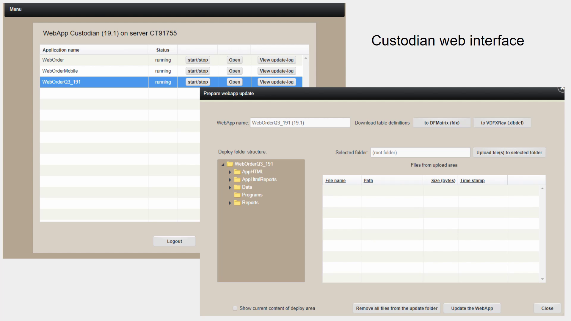 With a list of web apps on the left and a panel for updating the selected web app on the bottom right. It is suited for simple updates meaning that all files can be updated, but updating the database definitions or copying over whole folder structures is out of scope for Custodian 19.1.