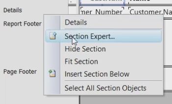 Move the mouse to the left margin of theReport Designer, click the right mouse and open the section expert.