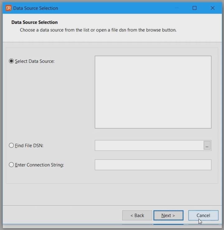 The wizard shows the content of your system and user DSN’s. This allows to use a file DSN or a connection string.