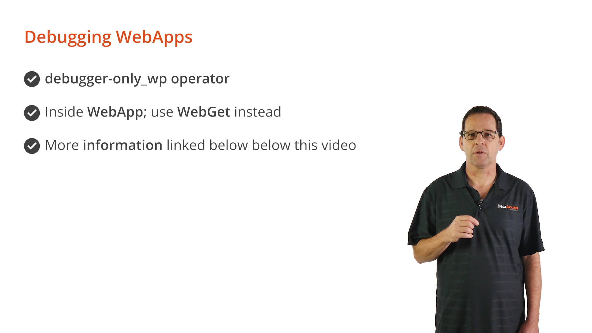 Web properties are complex properties that have both design time and web session values. Web session values of web properties can be evaluated in the Debugger using the Debugger-only “_wp” operator. Inside running WebApp code, “WebGet” can be used instead.