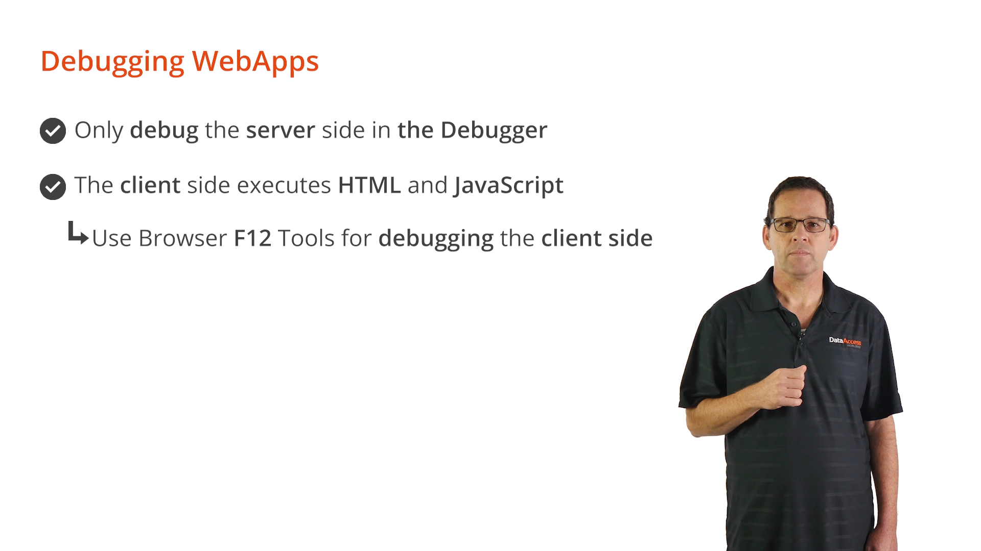 When running a web application in the debugger it is being run as an emulation of a full web service. A web application typically runs in a process pool where several processes are pre-loaded and take turns processing requests from the web client. Requests from the same WebApp session may connect to different processes. Debugging a WebApp runs as a single process, which means a process pooling environment cannot be completely emulated. Since the Debugger is part of the Studio, it runs under the same Window’s user account as the Studio. This may not be the same user account the DataFlex web application service runs under. As a result, access to databases and other files and locations that require permissions may not be the same as when the actual web application runs.