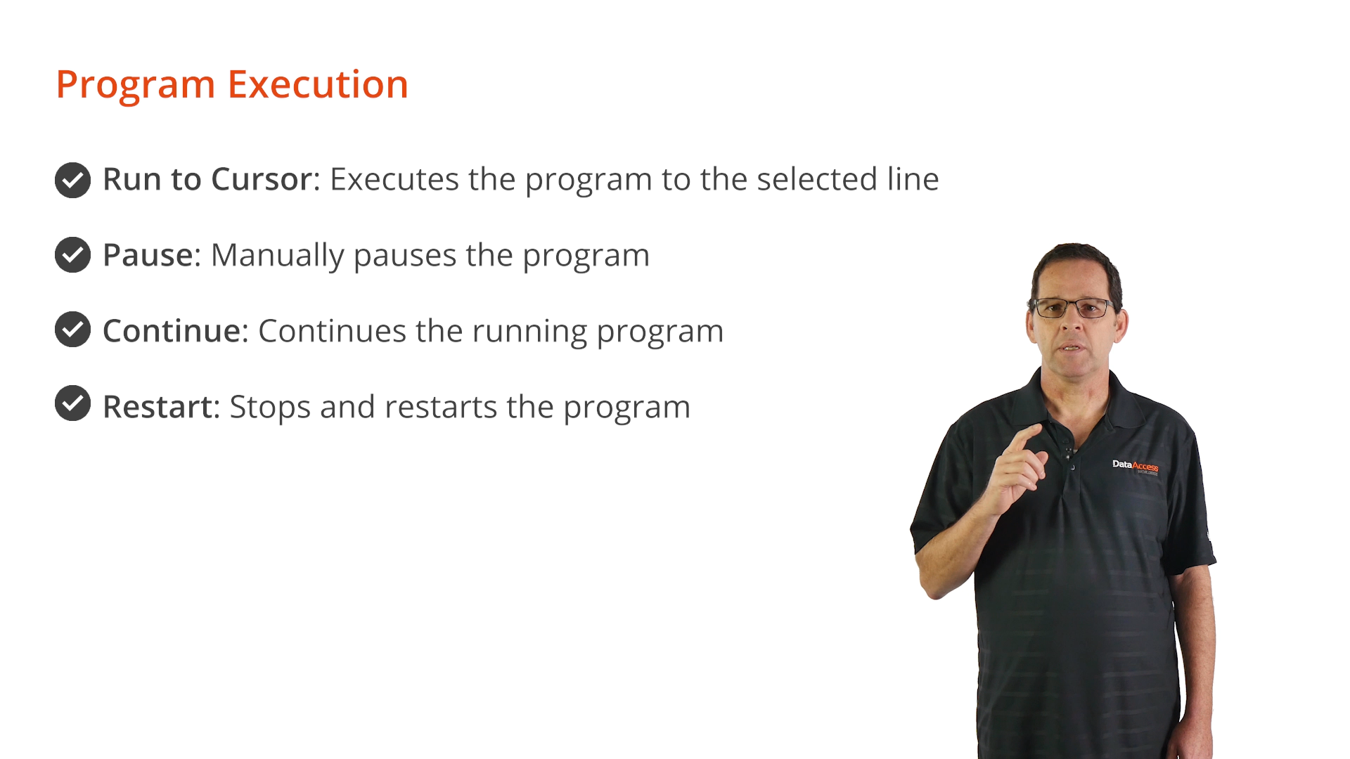 - Pause: manually pauses the running program at the next possible opportunity without requiring a breakpoint