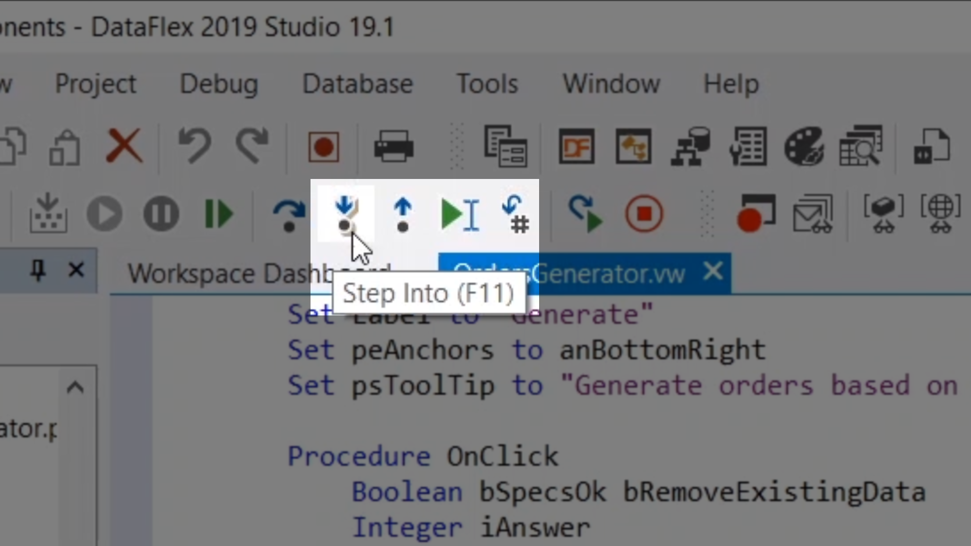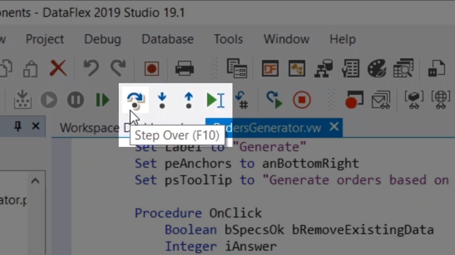 - Select the ‘Step Over’ icon again to execute the current line containing bRemoveExistingData
