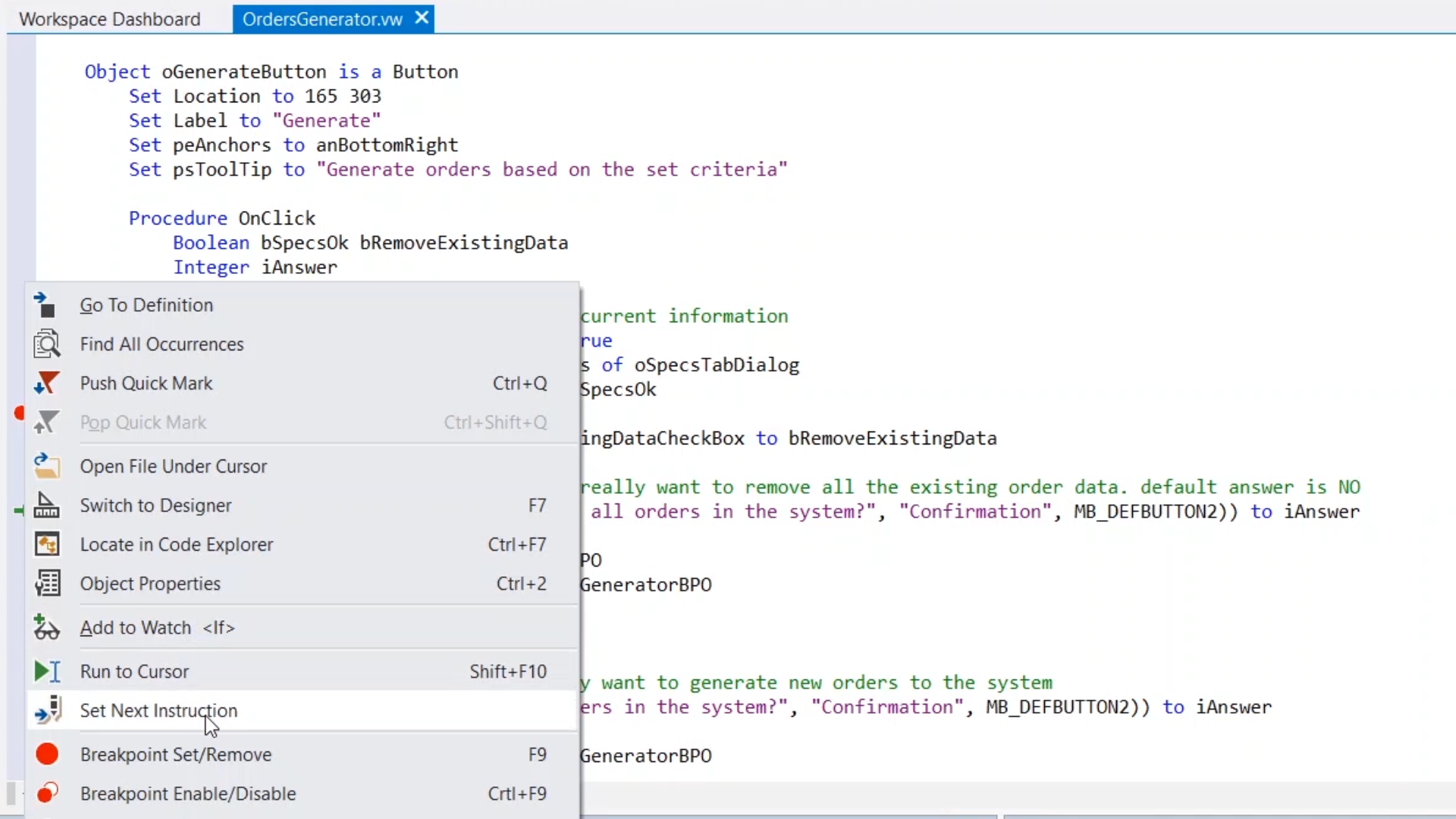 - Set Next Instruction: moves the instruction marker to the selected line of code