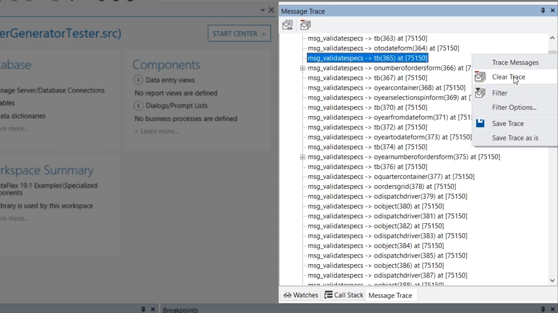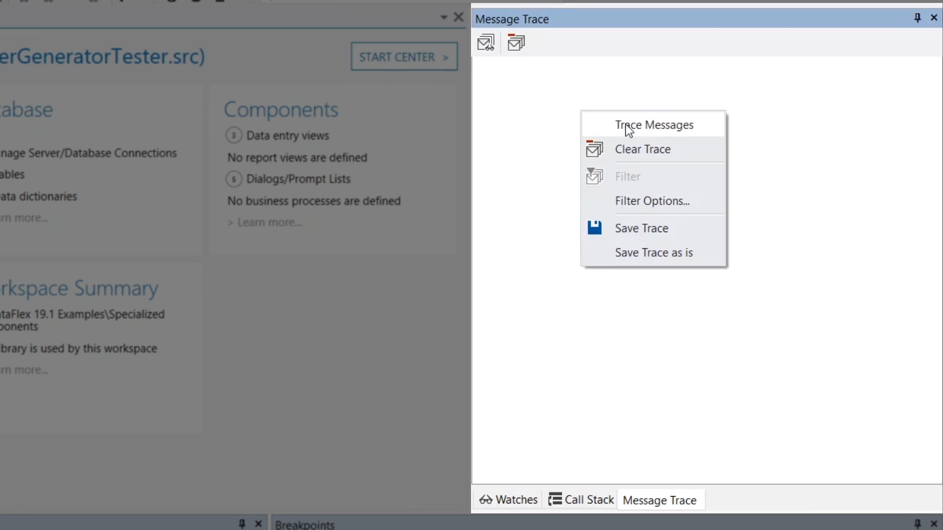 Messages can be traced as a program is executing both while running or being stepped through. Frequent messages can be filtered out to reduce unimportant messages and create a clearer trace. Message traces can be saved as plain text files.