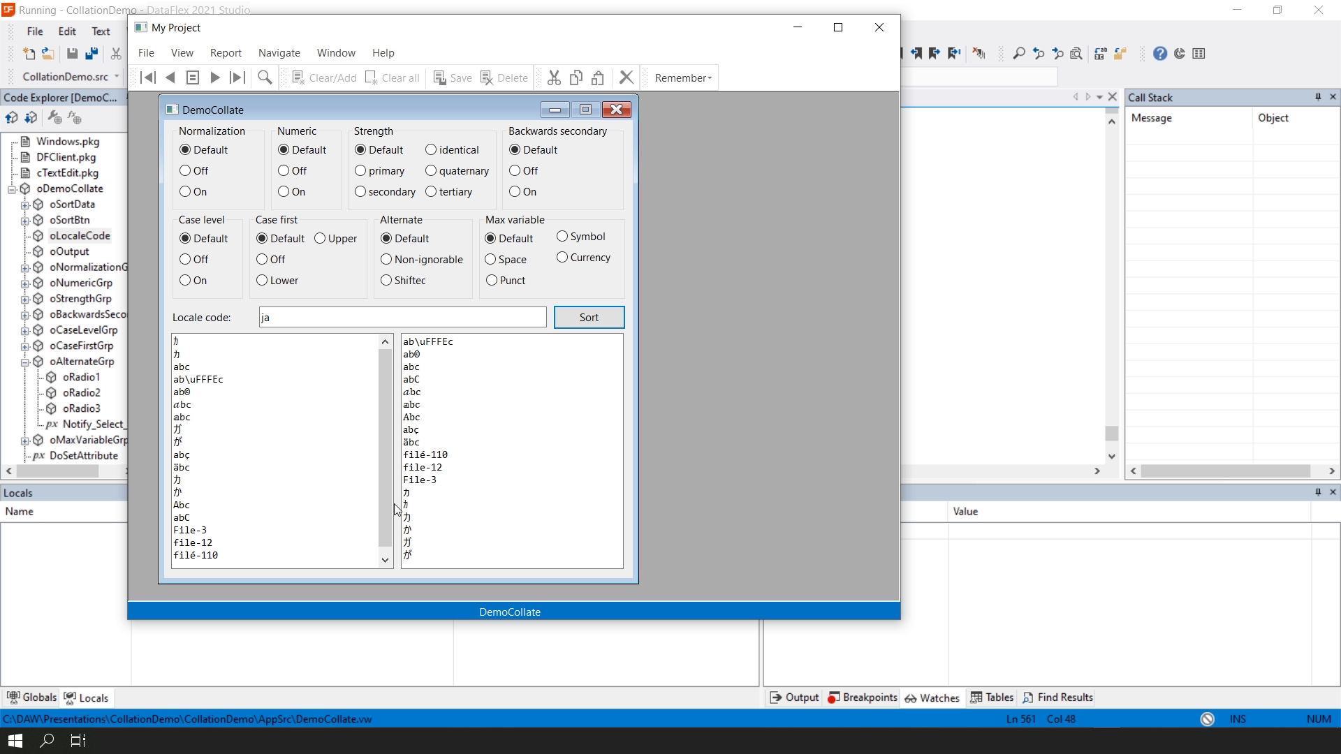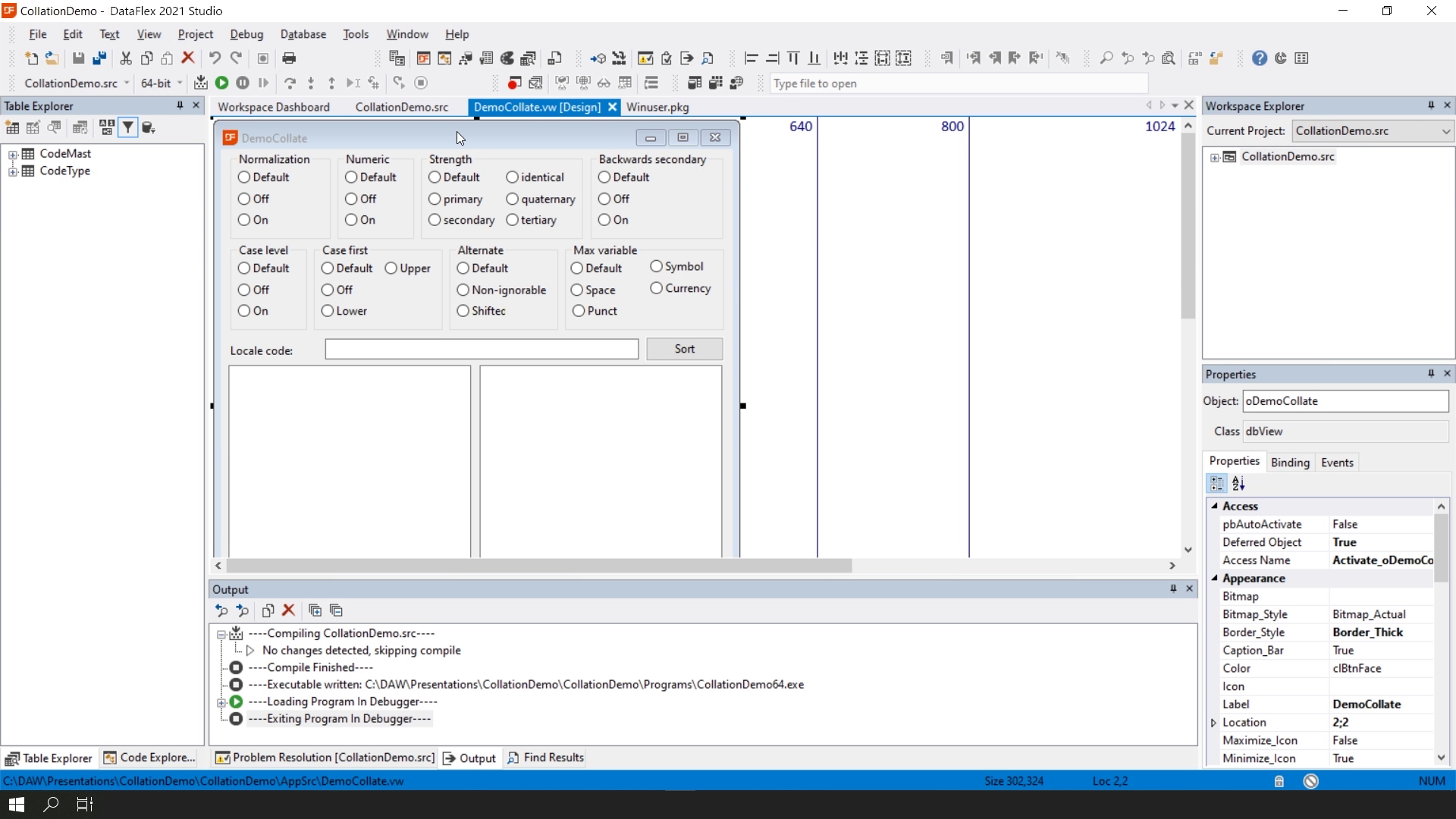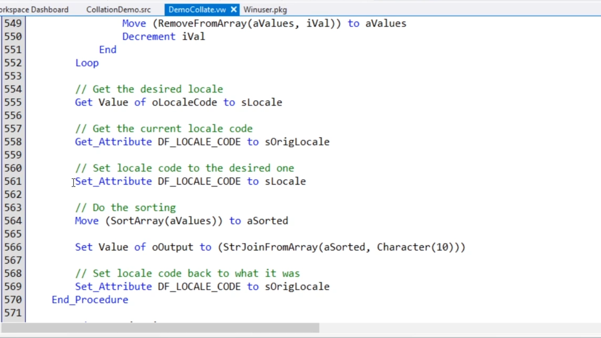 This lesson we will look at sorting and comparing string data from the database, otherwise known as collation. Character data is sorted and compared using rules that define the correct character sequence, with options for specifying case-sensitivity, accent marks, etcetera.String comparisons with Unicode are much more complicated than with OEM or ANSI. DataFlex 2021 uses the ICU Library for comparing strings according to the Unicode standards. ICU is a cross-platform Unicode based globalization library. Multiple collations are supported and can be configured via the new DF_LOCALE_CODE string attribute. This global attribute defaults to the language of the operating system and can be changed at runtime. This website for the available locale codes: http://userguide.icu-project.org/collation/customization