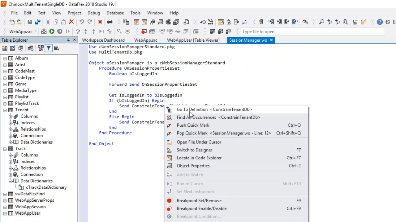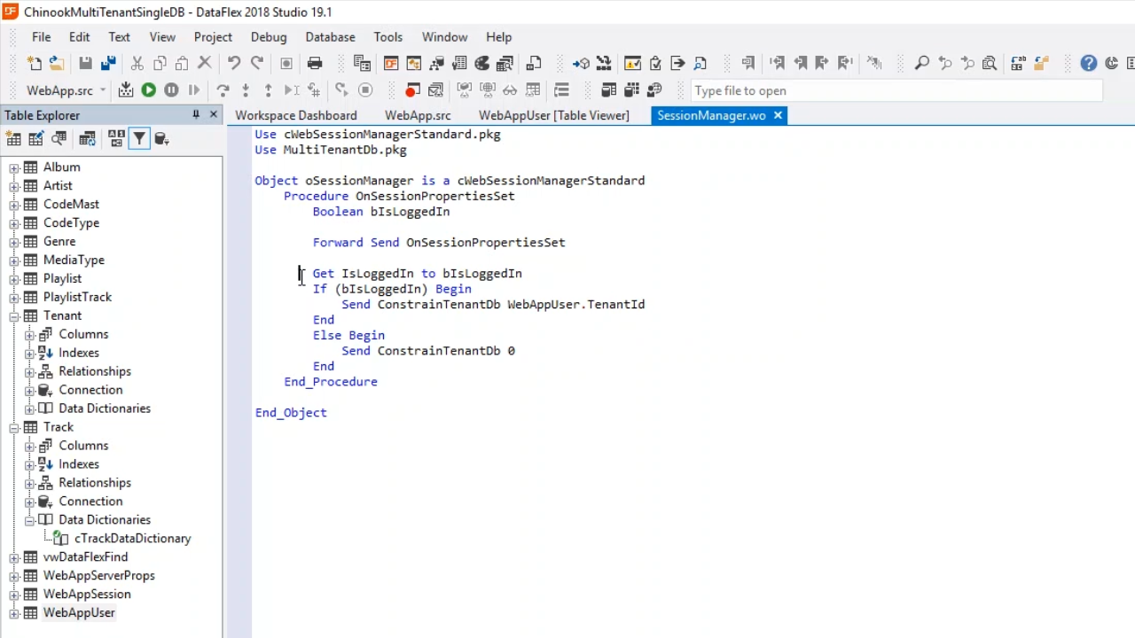 - Open ‘SessionManager.wo’ from the Workspace Explorer on the right. The OnSessionPropertiesSet function is implemented. It first checks if the user is logged in. If logged in, the ConstrainTenantDb is called, and the WebAppUser.TenantId is passed. This function is called for each request that comes in. If the user is not logged in, it is constrained on TenantId 0, which does not exist. The user will not be able to see any data.
