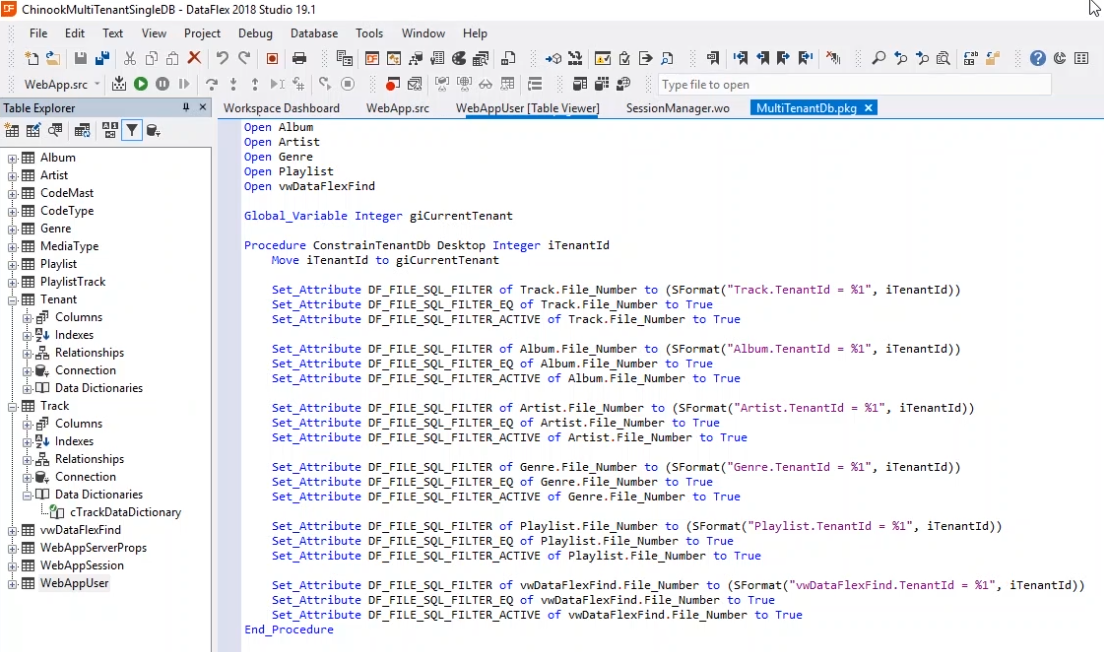 - This is exactly the same function that was used in the previous lesson when discussing Windows applications. The SQL filters are being set for all the different tables, and the global giCurrent Tenant.