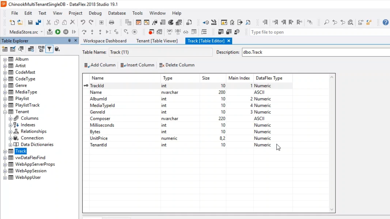 There is also a tenant table, which initially contains three tenants. During the demonstration data will be constrained by these three tenants. For example, the ‘Track’ table shows that it includes a ‘TenantID’ that matches one of the tenants.
