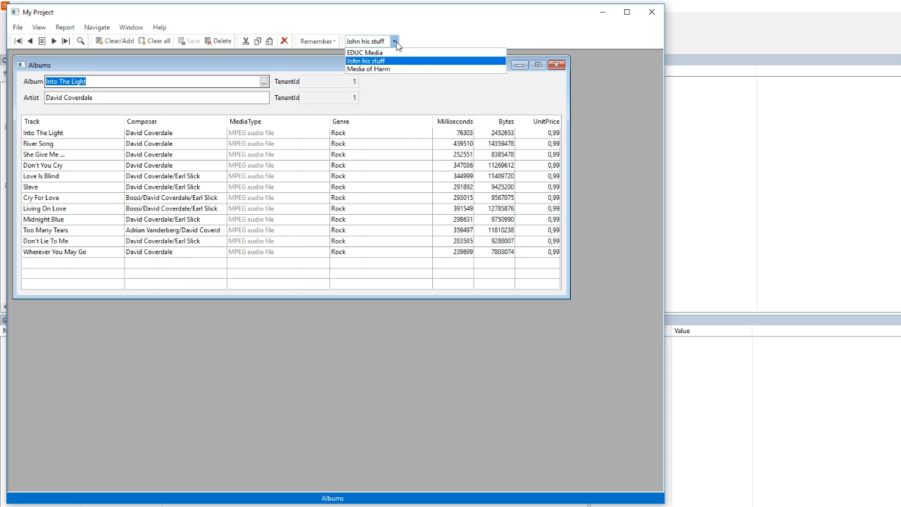 Running the application shows the combo that displays the different tenants that available for selection. Opening the ‘Albums’ view should only show data that applies to the selected tenant.