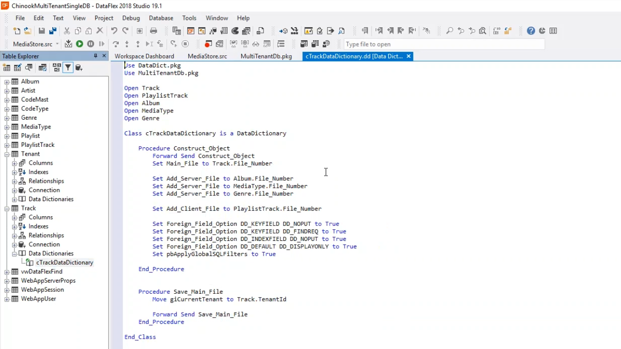 In the DataFlex Studio, double clicking on the combo displays its code. It shows that the tenant selection menu item, and that on creation it fills the combo list. When an item is clicked it is going into ‘SwitchTenant.’ Drilling into SwitchTenant (right click on it and select ‘Go To Definition’) shows that it is a global procedure that first calls a function called ‘ConstrainTenantDb’ with the TenantId. Then it calls a function that clears all of the views.
