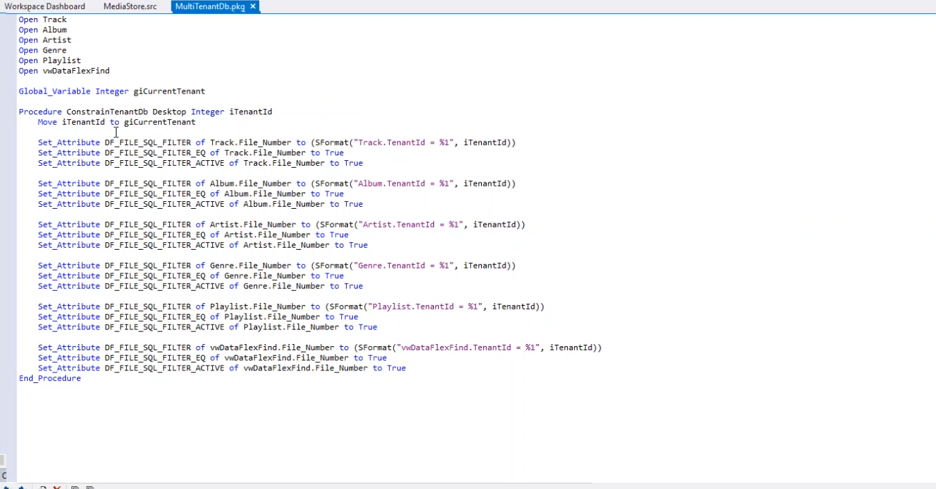 Returning to the SwitchTenant function, and then drilling into ‘ConstrainTenantDb’ the constrain database function is shown as a separate package so that it can be reused in different projects in the same workspace. All tables that have a TenantId are shown as open. A global variable called ‘giCurrentTenant’ is defined. When the function is called the ConstrainTenantDb function gets the TenantId and moves it into the global integer. Next, the different SQL filters for the different tables will be defined.