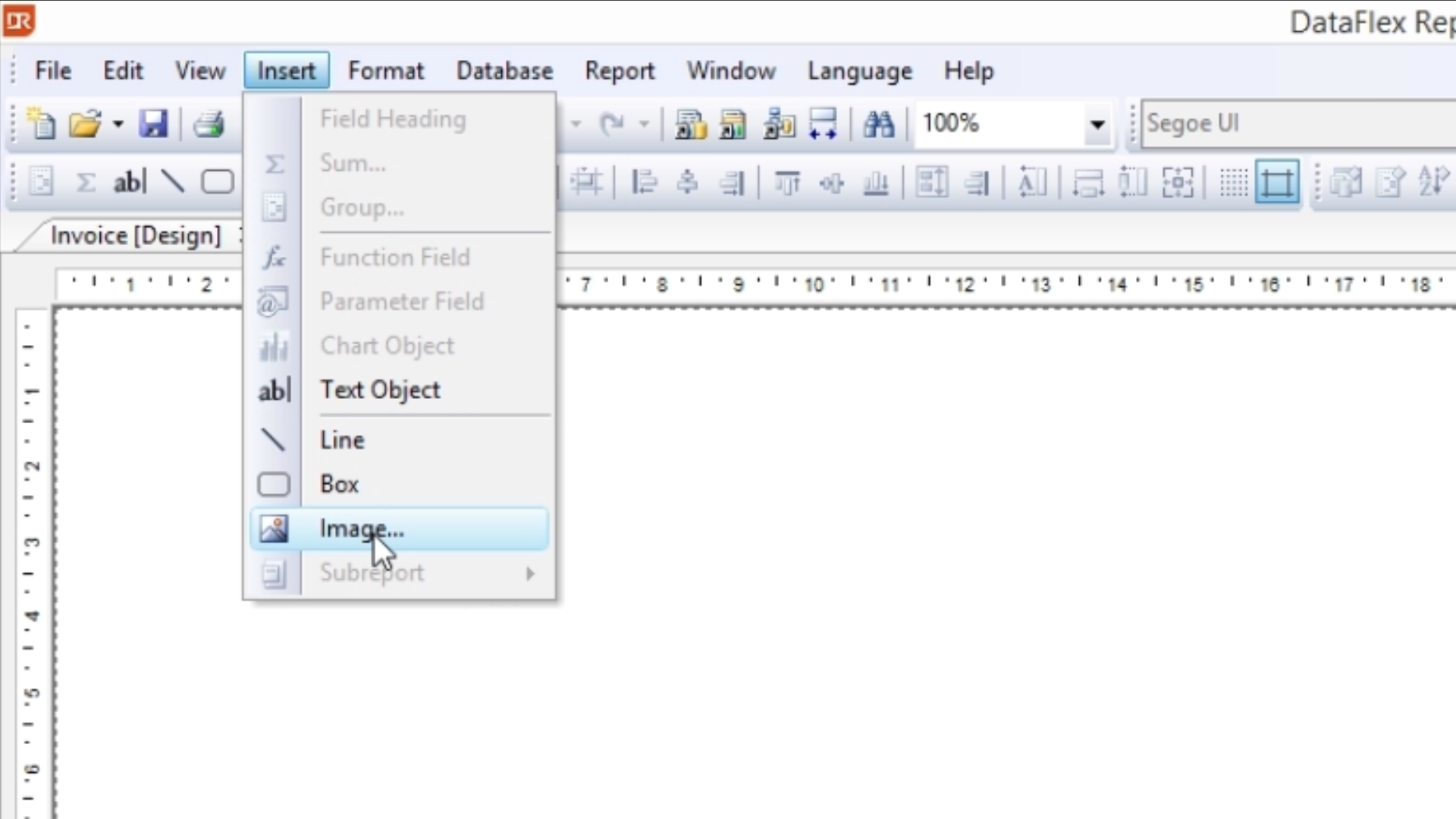 As done with the box in Lesson 1, change the image’s size and location in the Field Properties dialogue, so that the image is positioned at the bottom of the report.