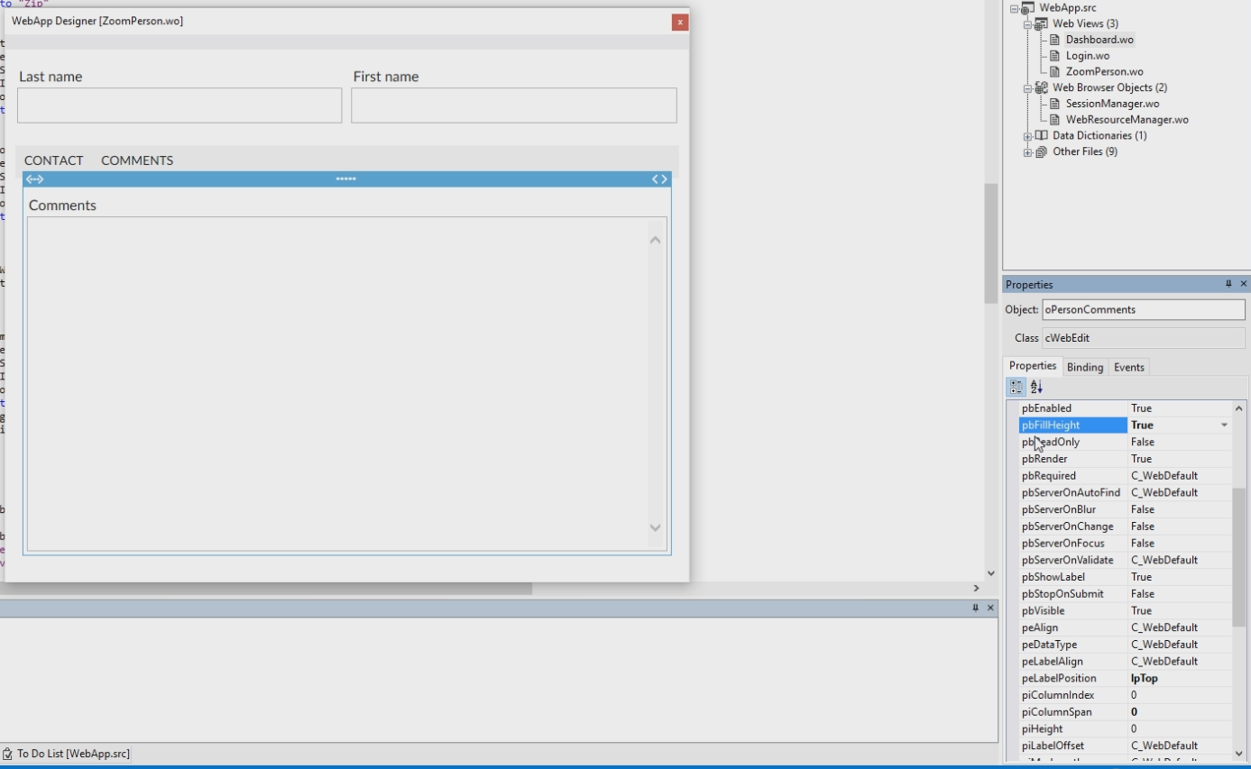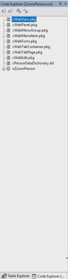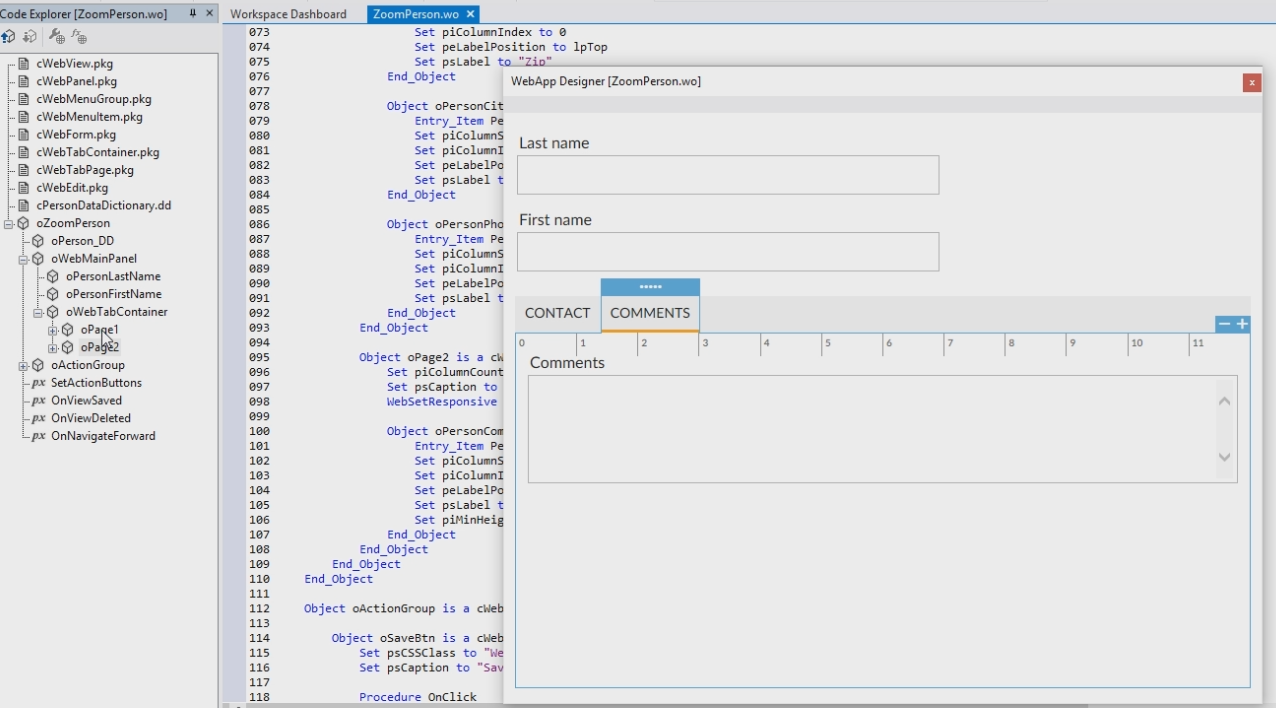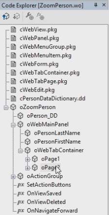 The View object is called "oZoomPerson". In this View Object is a panel called oWebMainPanel. In this Panel are the LastName and the FirstName. The oWebTabContainer contains Page1 and Page2.