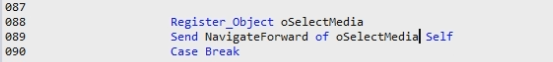 - On the next line enter: Send NavigateForward of oSelectMedia Self. This basically tells the Framework to navigate into this view. Self is a reference for the current view, so it knows which view we are coming from and what record it should select.