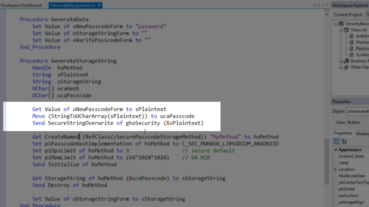 To look at the code for the button, expand ‘oPasscodePlayground’ in the ‘Code Explorer’ panel on the left, and select ‘oGenerateButton.’