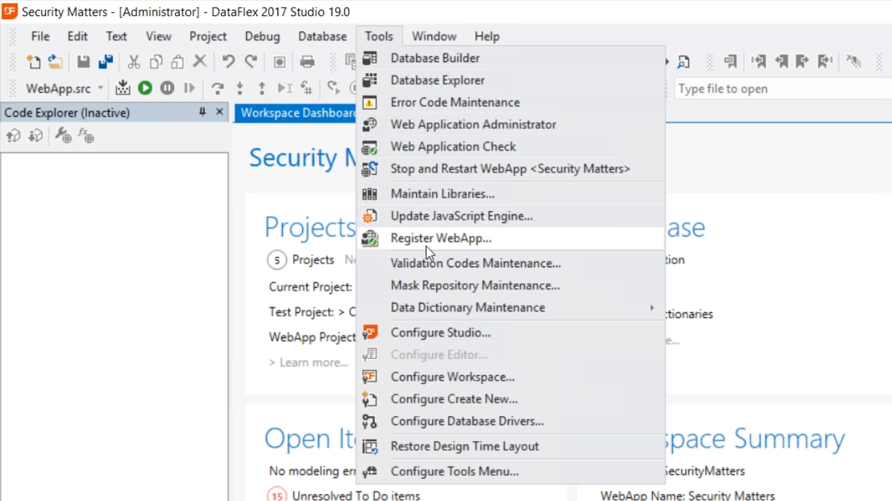 - To register the WebApp, go to the DataFlex Studio
