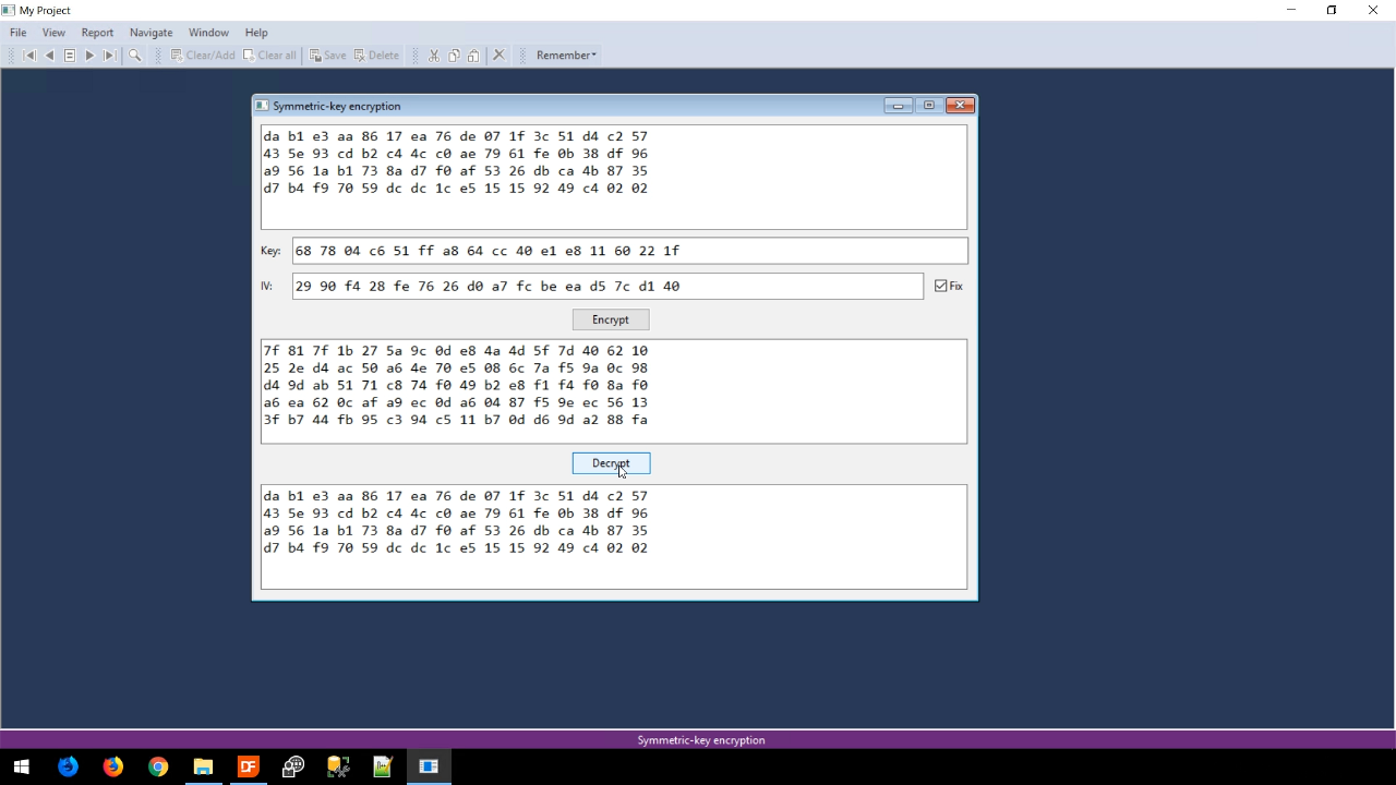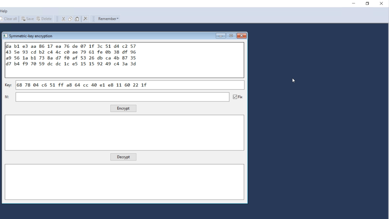 When the ENCRYPT button is pressed the data is encrypted into the middle field. The encrypted data is called sypher text. The original data was just plain text. The Initialization Vector (IV) field was also filled in. If the IV field is fixed (the ‘Fix’ checkbox is marked), the encrypted output will remain the same regardless of how many times the ENCRYPT button is pushed.