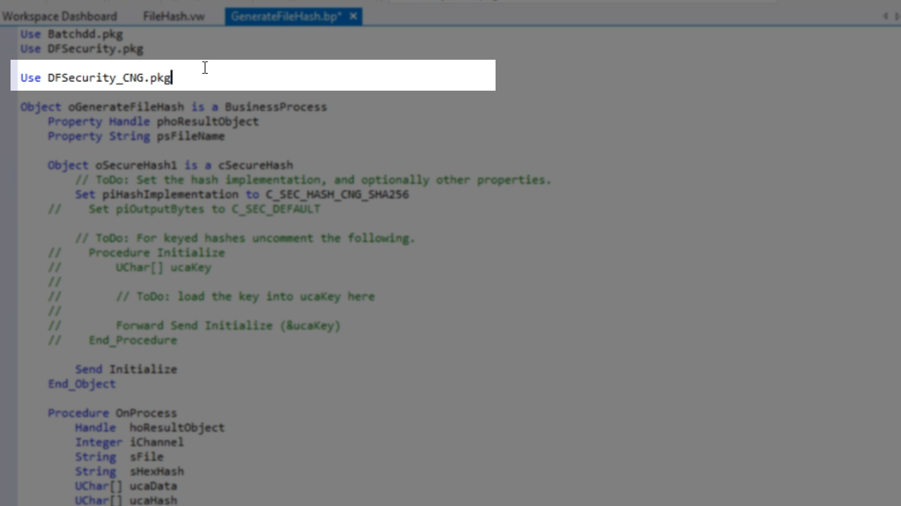 - Then, from the palette panel on the left, expand ‘DataFlex Security,’ and drag-and-drop ‘cSecureHash’ into the code.