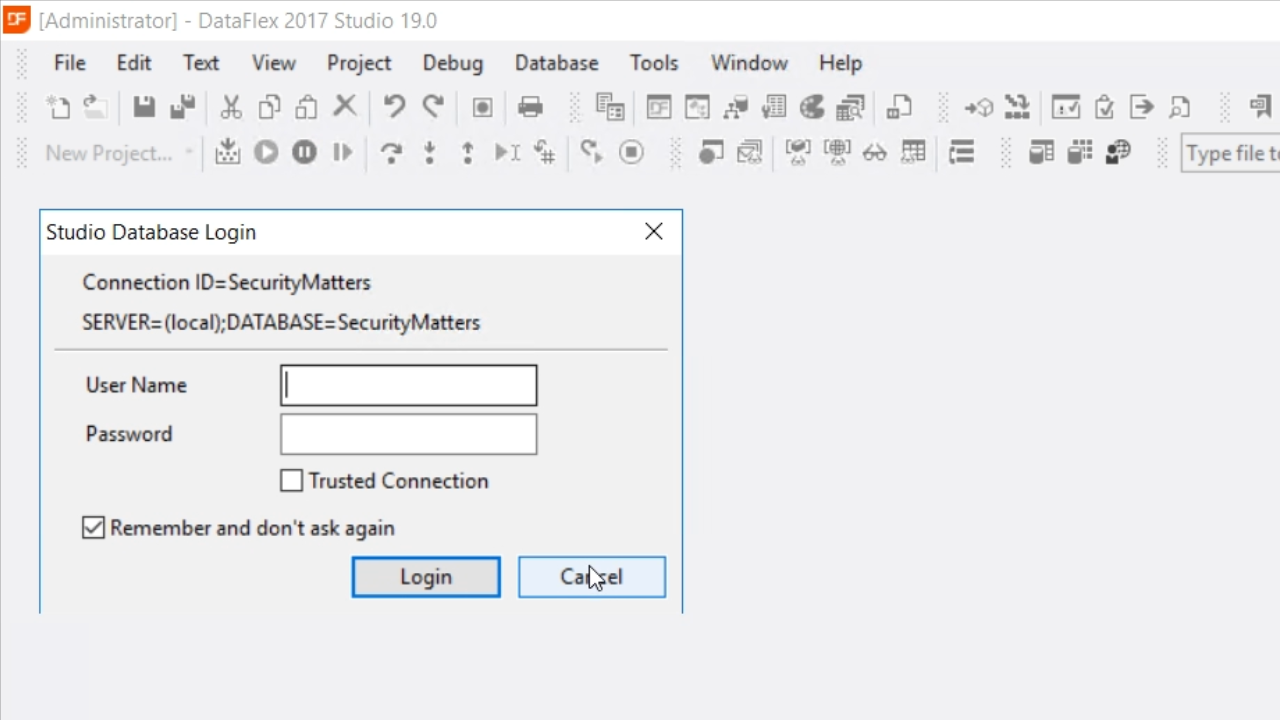The default connection is shown even though it has not yet connected. Select the EDIT button. The ‘Connection Id’ and the ‘Select or enter a Server Name’ are correct for this example. ‘Use Windows Authentication’ needs to be checked. At this point, there is no database. Select the ‘Create Database’ button and enter a name in the following popup. “SecurityMatters” is used for this example. Select the ‘Test Connection’ button, and the message “Login to server successful!” should appear. Select OK, and then SAVE.