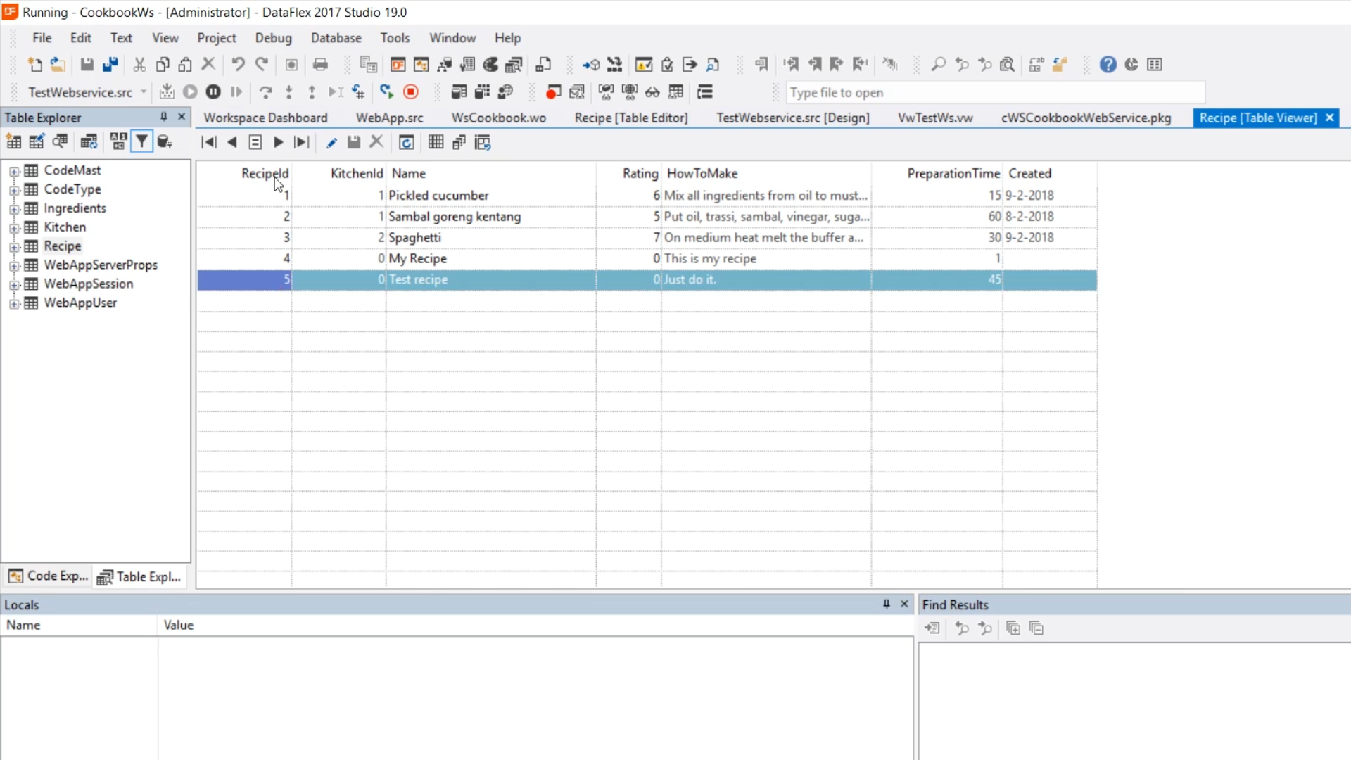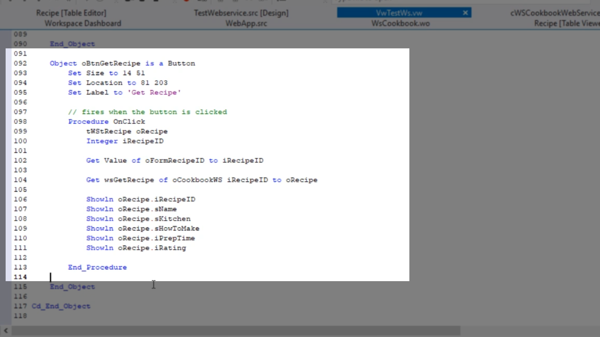 - Returning to the DataFlex Studio, select the ‘cWSCookbookWebService.pkg’ tab.