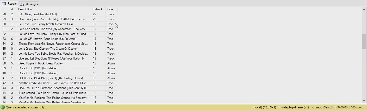 - After executing this, you see a lot of results. ID: The primary key on that specific table.FtsRank: The full text rank. Type: Data source which can be, track, album or artist.