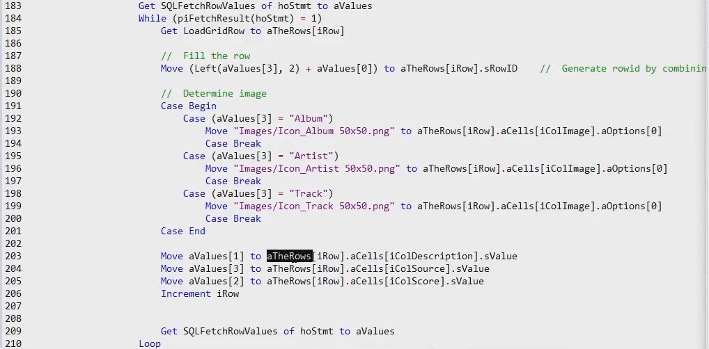 - In this fetch loop we call ‘SQLFetchRowValues’ to get the different rows and we put that into the results row, the web grid rows, and they are shown in the list.