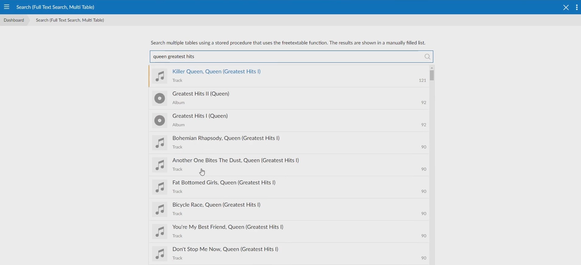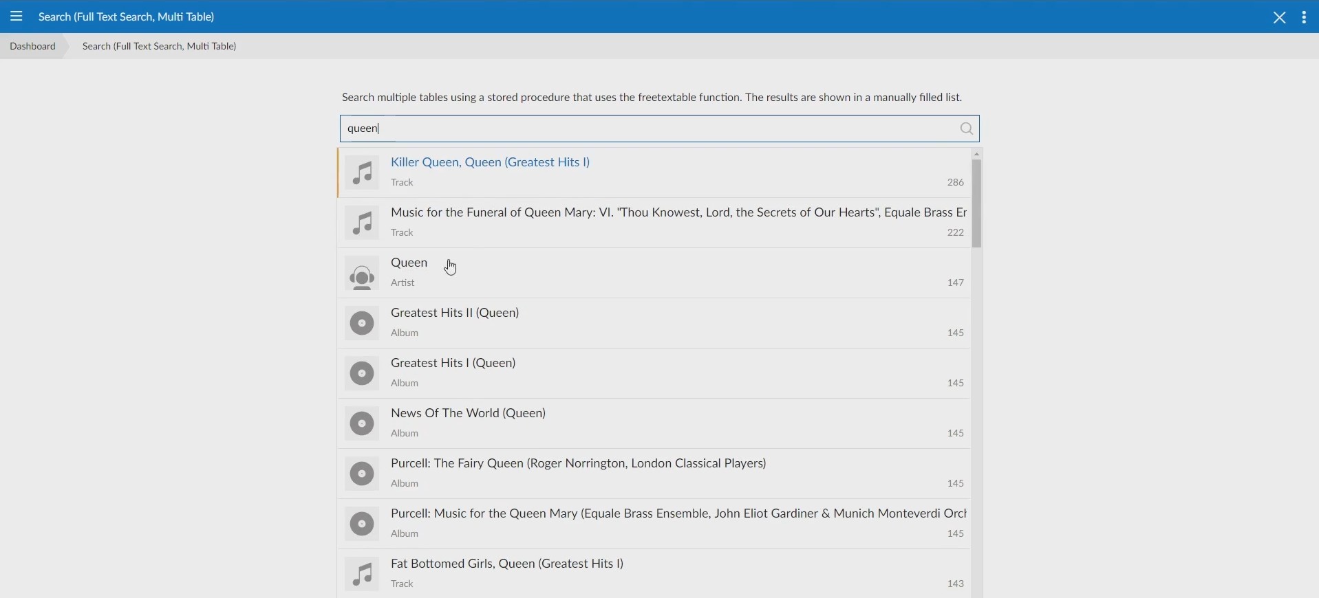 - When running this sample, you should now find multiple results including artists and everything else. So for example searching for Queen we get the artist Queen, tracks from Queen, and albums from Queen.