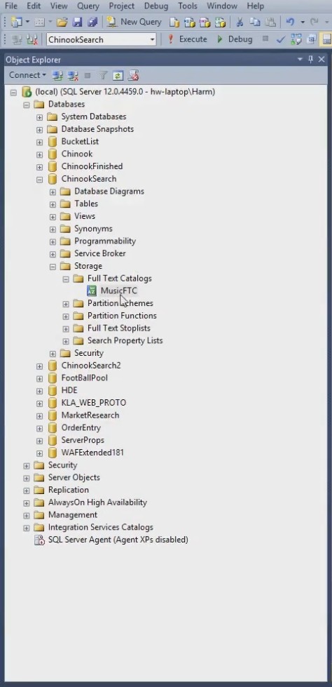 In the SQL manager you can see we are using the Chinook search database, in this database there is a full text catalogue that indexes the several fields of the database.