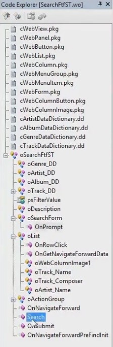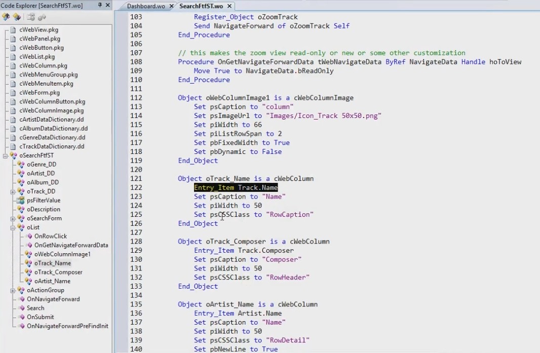 Within this view you can see several objects, a DEO structure so the data dictionaries are all available. There is a search form on top and there is a list, which has several columns and these columns are simply data bound. So the track name is bound to the track name database field, it’s a data aware list.