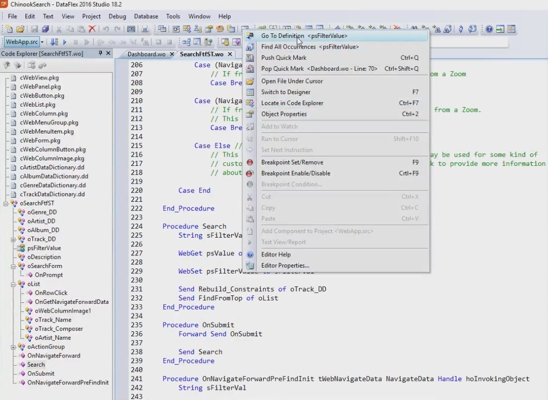 When the user searches, we execute the search function. We’re getting the value from the field and are putting that in a property that we have defined, the ‘psFilterValue’.