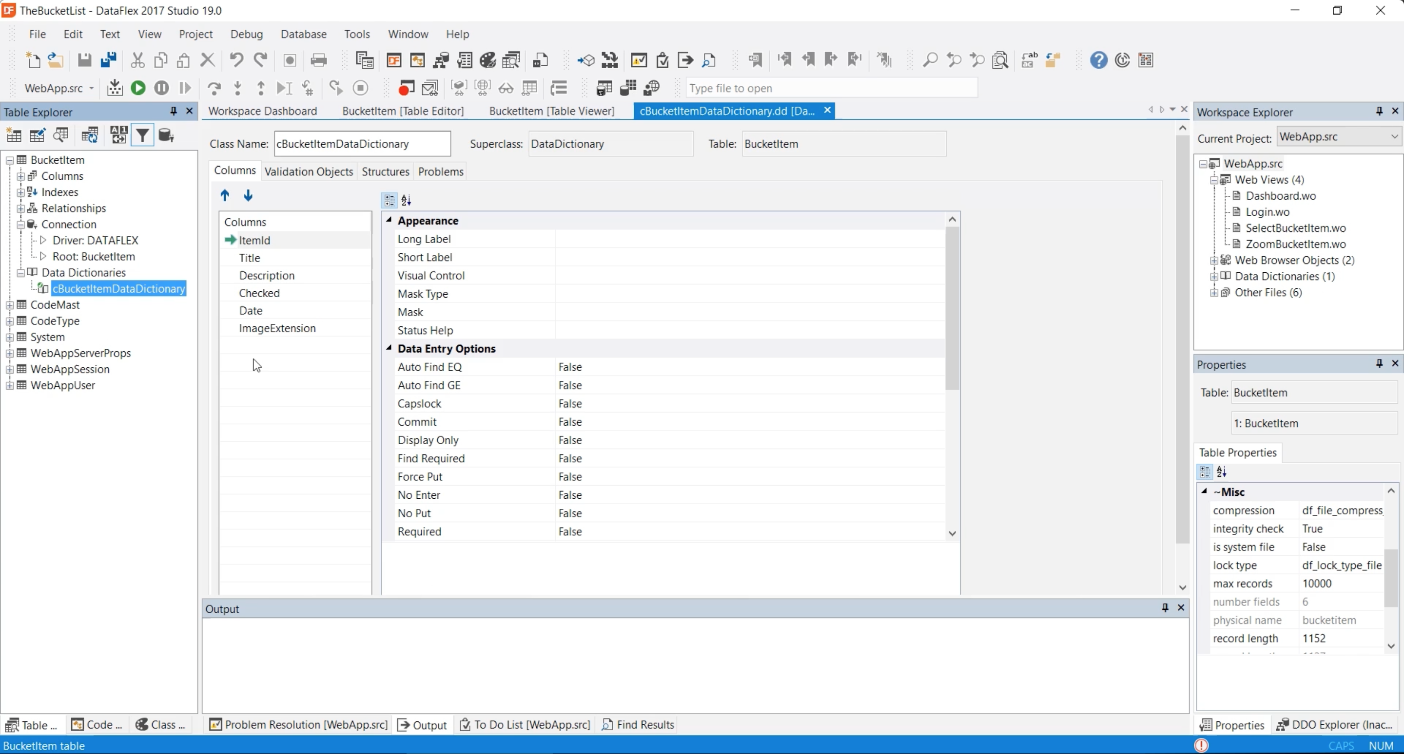 - Open thet data dictionary to open the data dictionary editor that shows the settings for the different columns of this table.