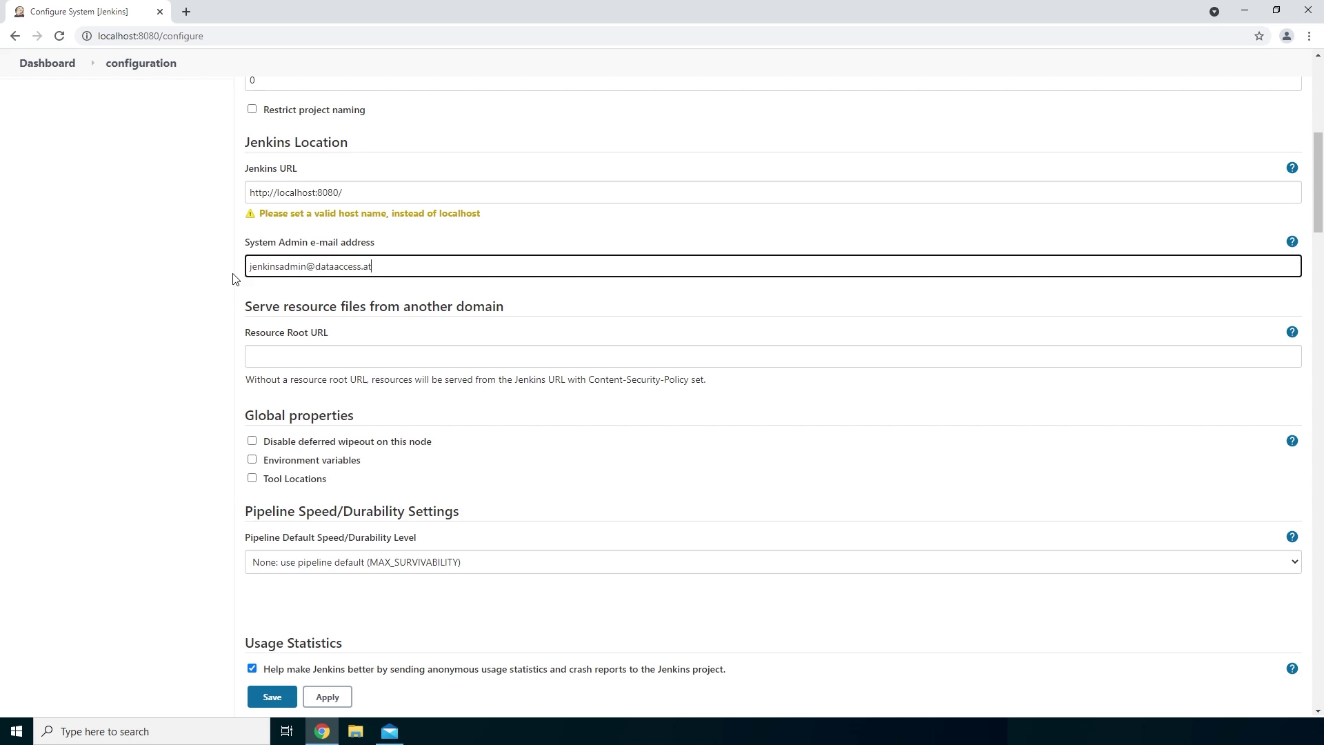 - The first thing we need to do is set the System Admin email address so we will receive the emails from this specific address. So let’s fill in jenkinsadmin@dataaccess.at.