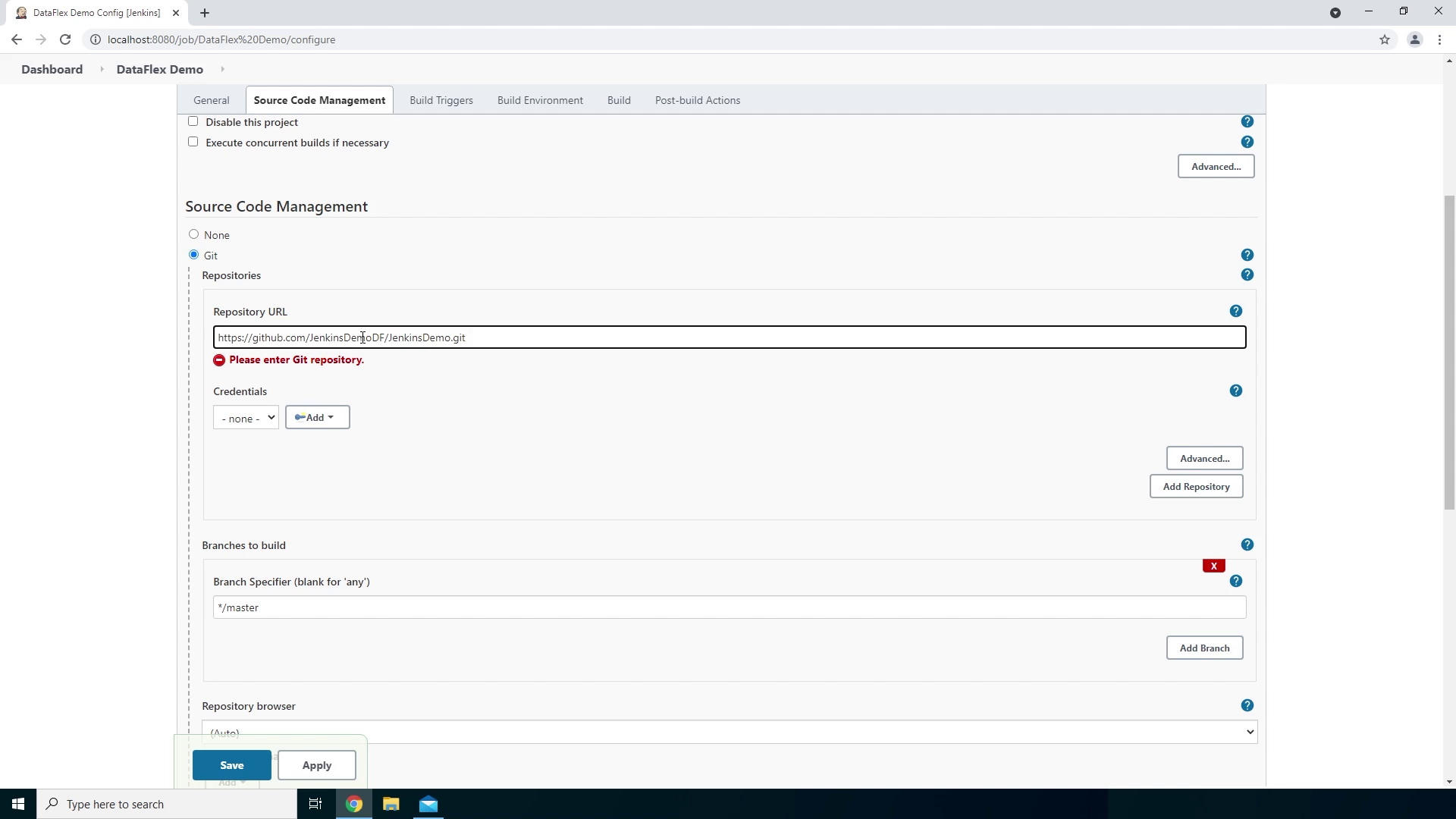 - So now we have added our credentials and we can select them in the dropdown box. Up next we can choose which branch we want to use. For this example we will use the Demo1 branch.