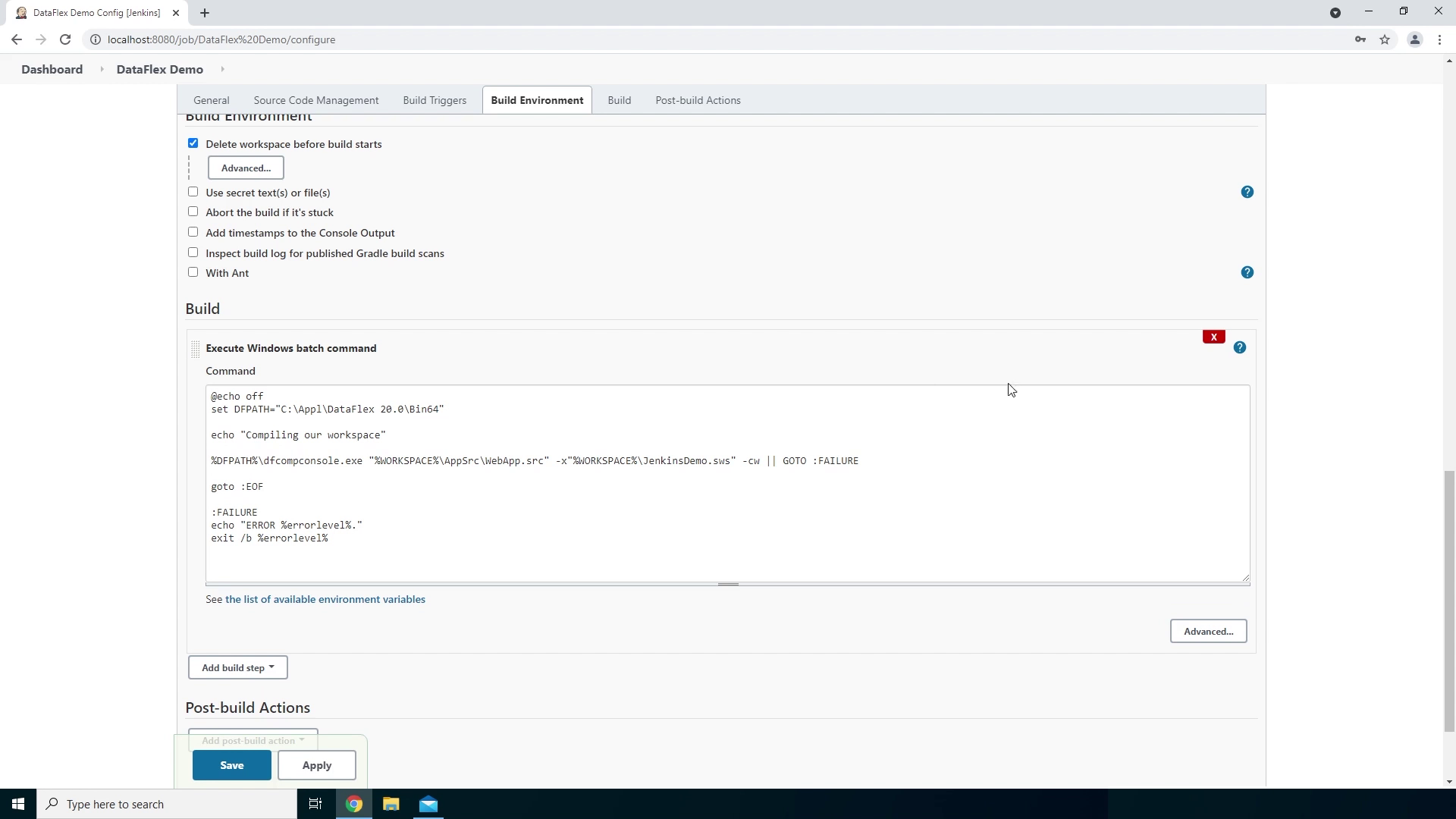 - At first it will set the path to the DataFlex Bin64 folder which I have installed earlier on. Within the Bin64 folder it will use the DfCompConsole executable to compile the WebApp.src using the JenkinsDemo workspace.