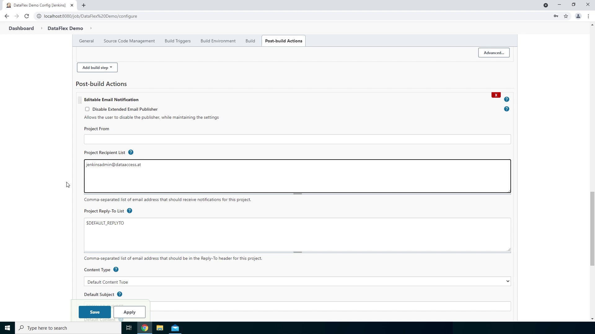 - The final step is to add a post-build action. Click on Add post-build action and then on Editable Email Notification. The first thing we want to do is add the email addresses we want to send an email to so we add them to the Recipient List. Within this example we will send an email to jenkinsadmin@dataaccess.at. We can leave the default values for the rest of the options.