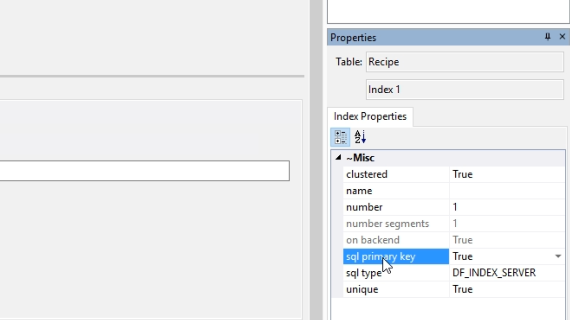 19. ‘Index 1’ is automatically added to the ‘Indexes’ list, and ‘RecipeId’ is added to the column list making it a unique index.
