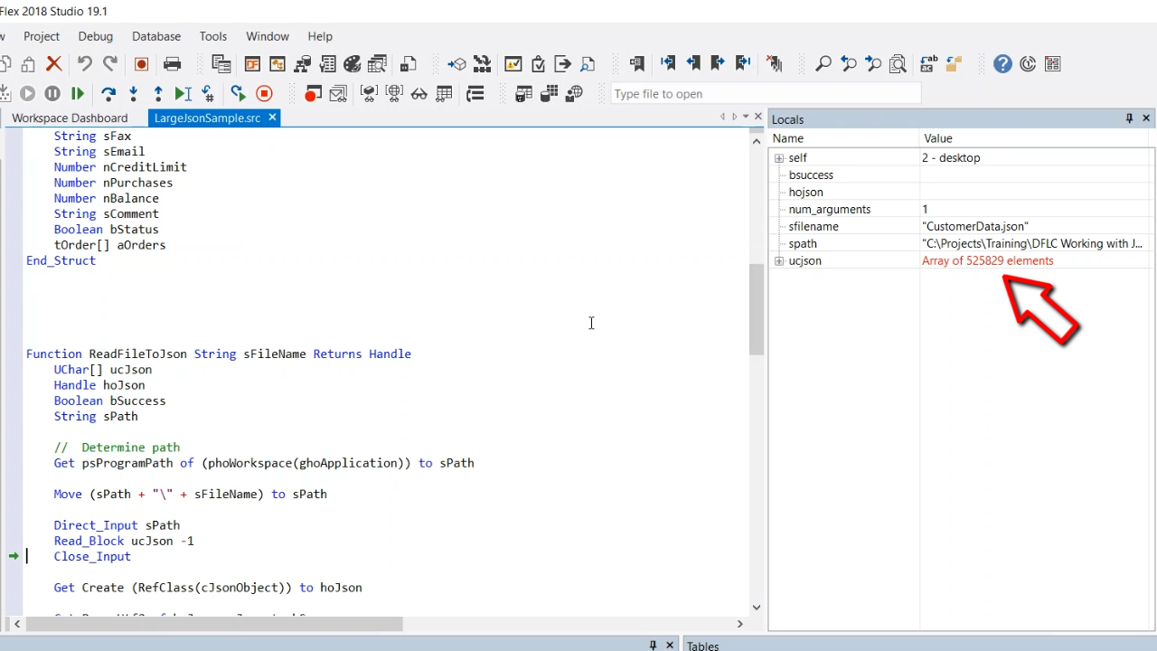 - The ReadFileToJson function will pass a file name that returns a handle to the JSON object. Then a UChar array is created to house the JSON data. The path is assembled then Read_Block is called to read the entire file to memory. The value for ucJson is shown as having 525,829 elements. It is not recommended to expand it to view.